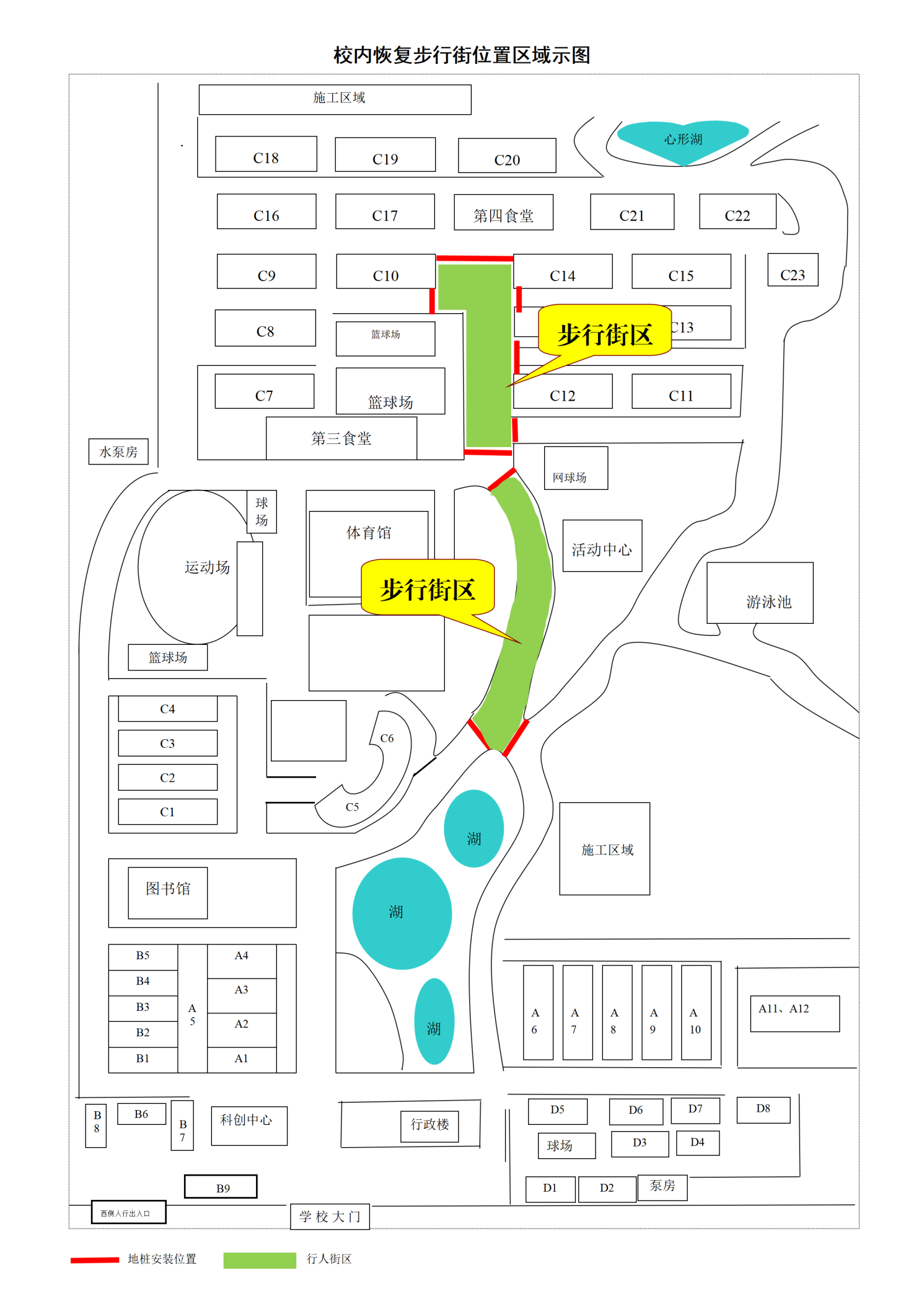 当前,中线路段仍允许机动车通行,而该区域日常行人流量大,尤其是上下课、就餐等高峰时段,机动车辆需在密集人群中穿行,人车混行现象突出,已形成较大安全隐患,对师生人身安全构成威胁。为消除此安全风险,保障师生安全出行,维护校园正常交通秩序,自通知发布日起,恢复校园中线行人步行街功能,该路段各路口常态化启用铁质栏杆进行围蔽(详见附图),禁止机动车辆驶入。如有特殊情况需要临时通行,请联系保卫处,联系电话36903186。